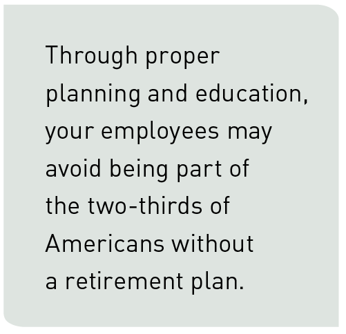 The Bottom Line. You have a significant influence on your employees’ financial future and retirement planning success. You are the example. Through proper planning and education, your employees may avoid being part of the two-thirds of Americans without a retirement plan. This focus will have a life-changing impact on their futures and you will have put your mark on the financial success for them, their family and their heirs.